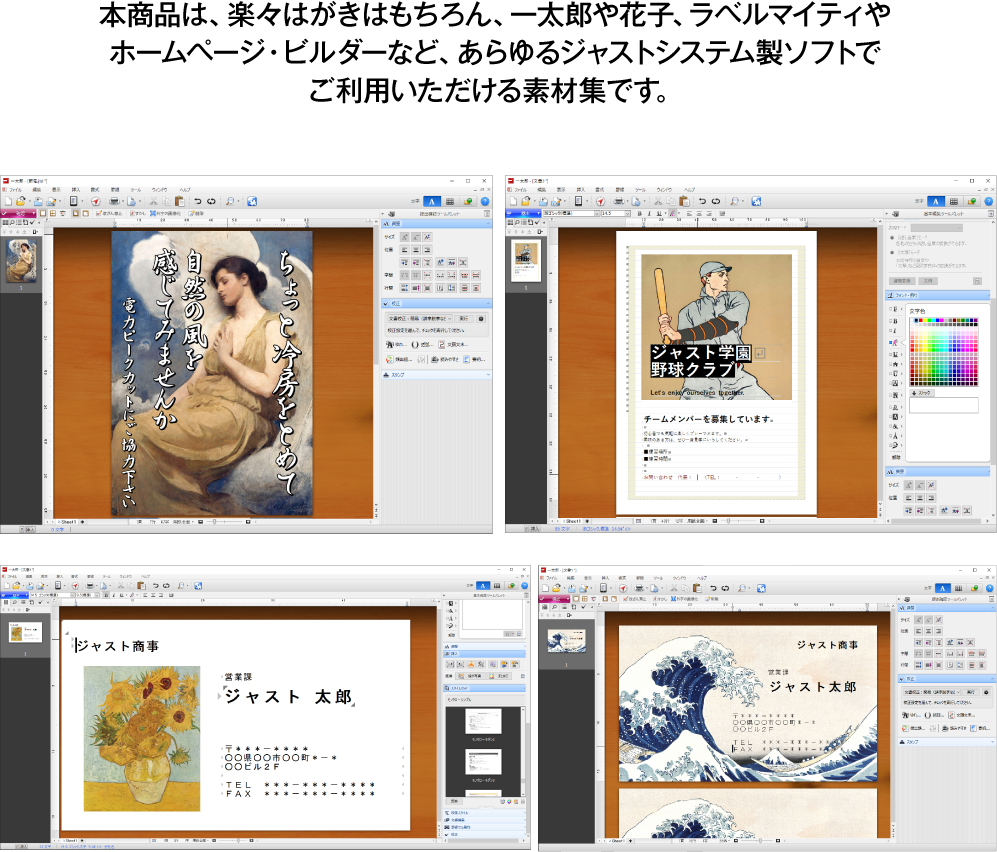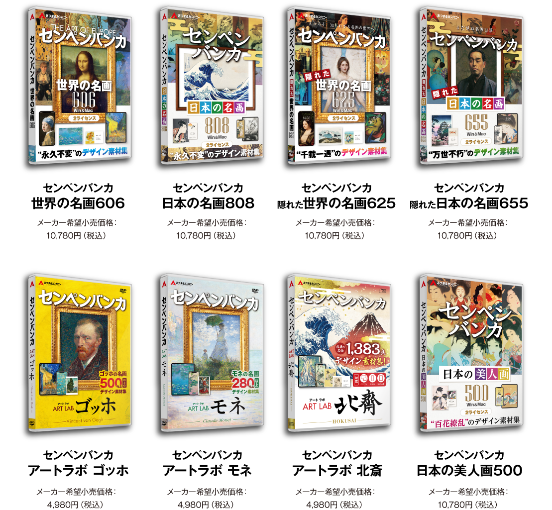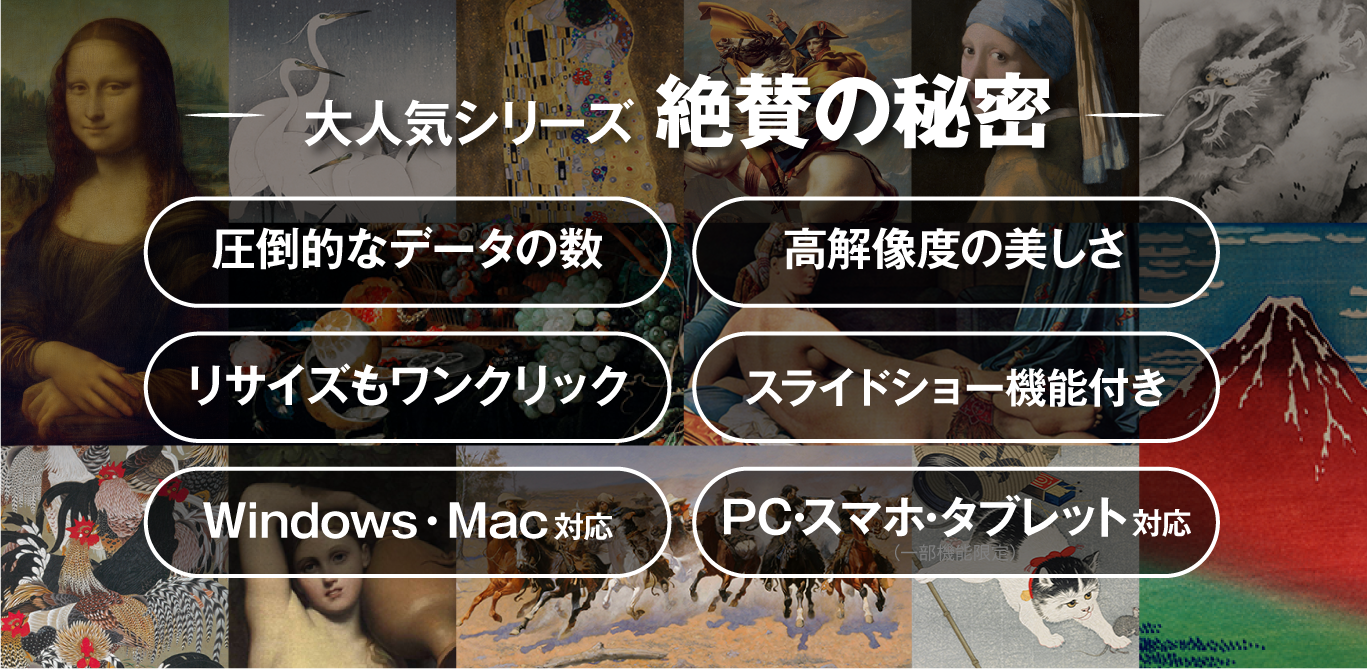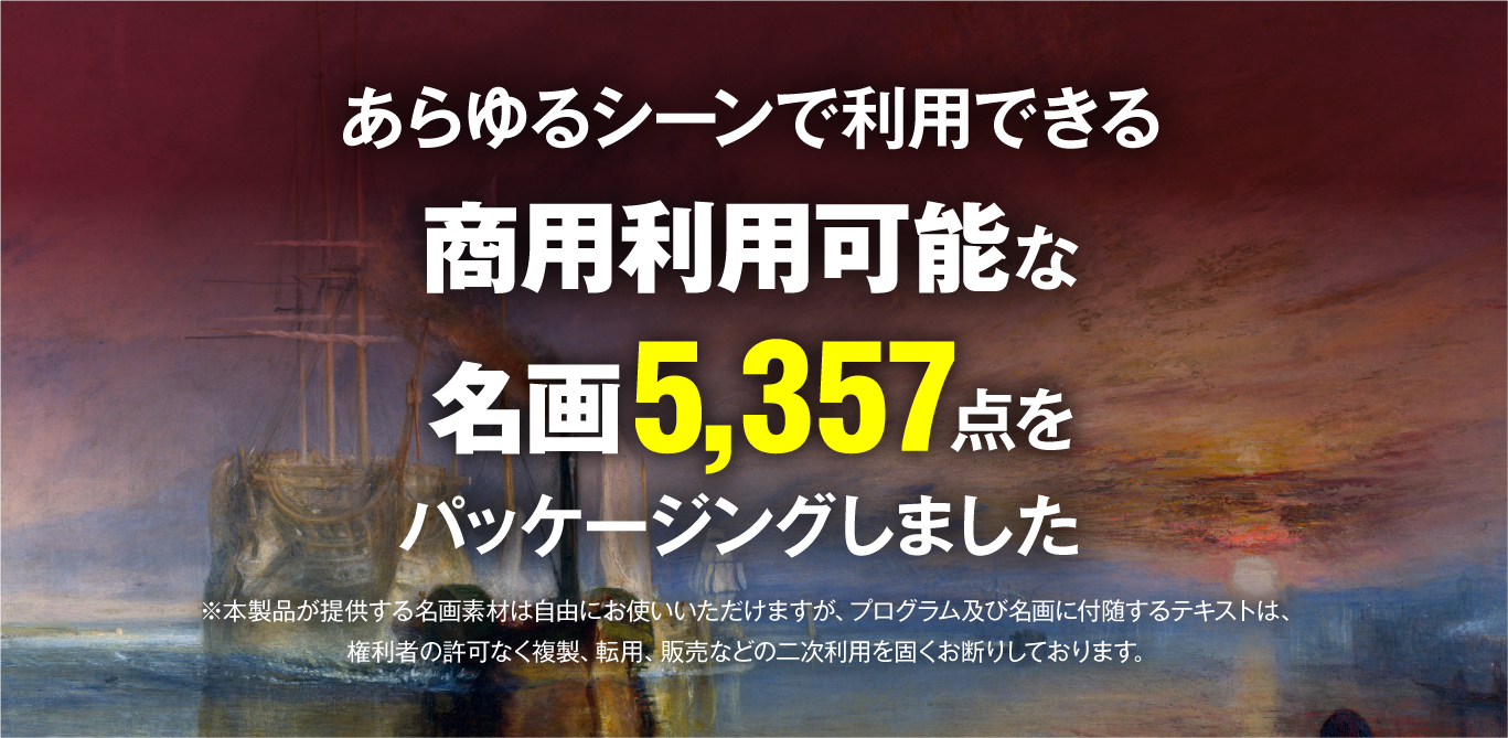 ※本製品が提供する名画素材は自由にお使いいただけますが、プログラム及び名画に付随するテキストは、権利者の許可なく複製、転用、販売などの二次利用を固くお断りしております。
