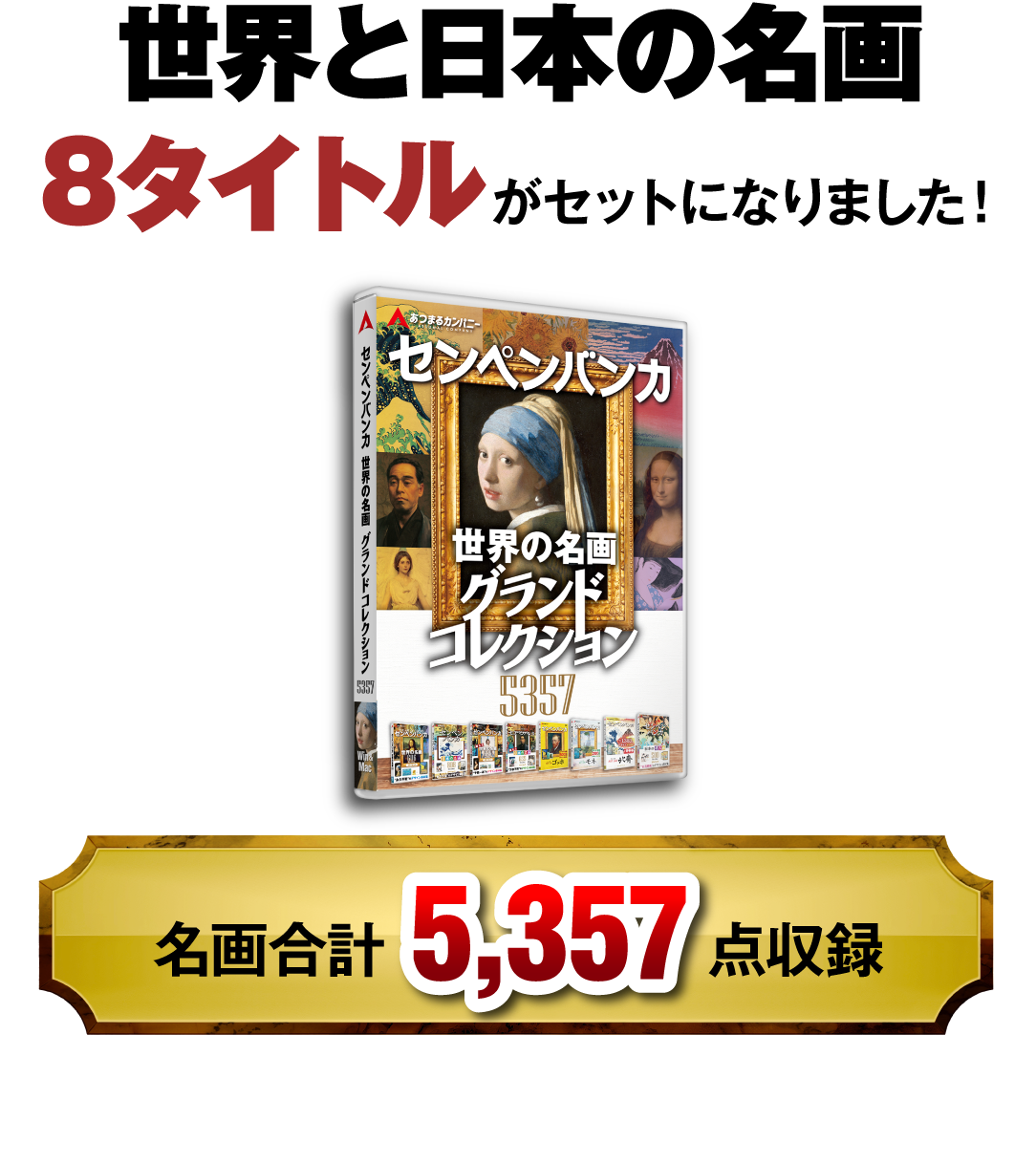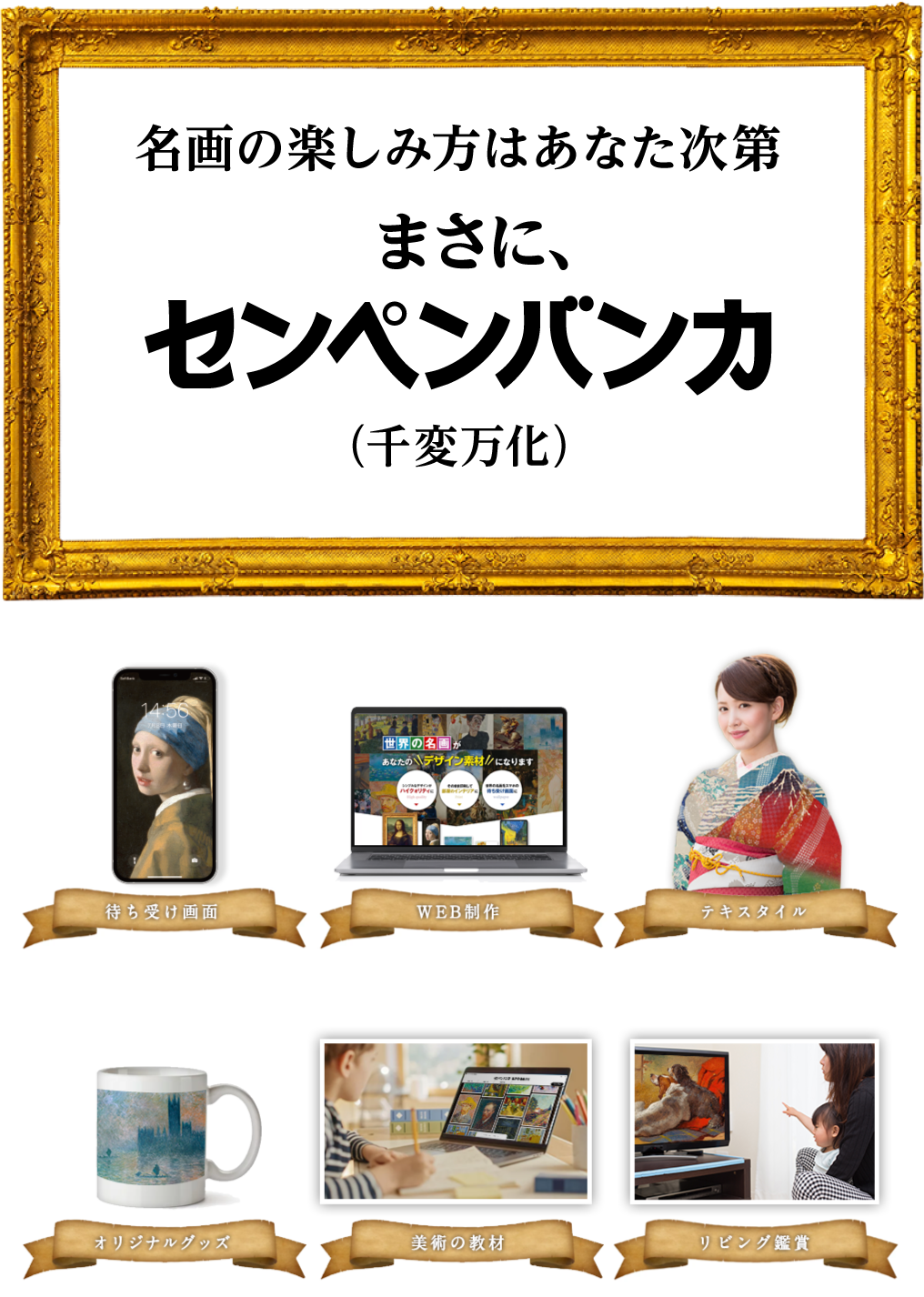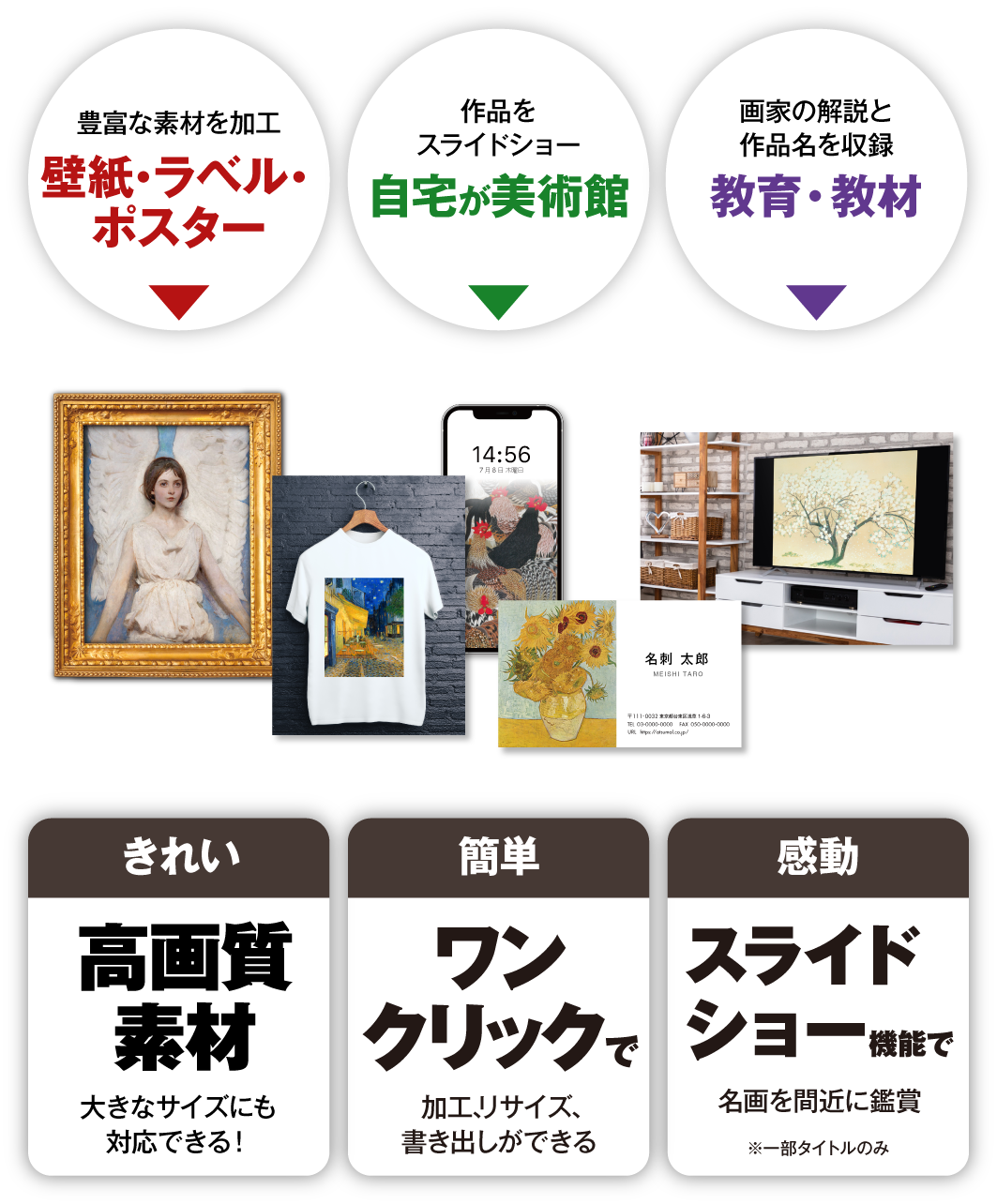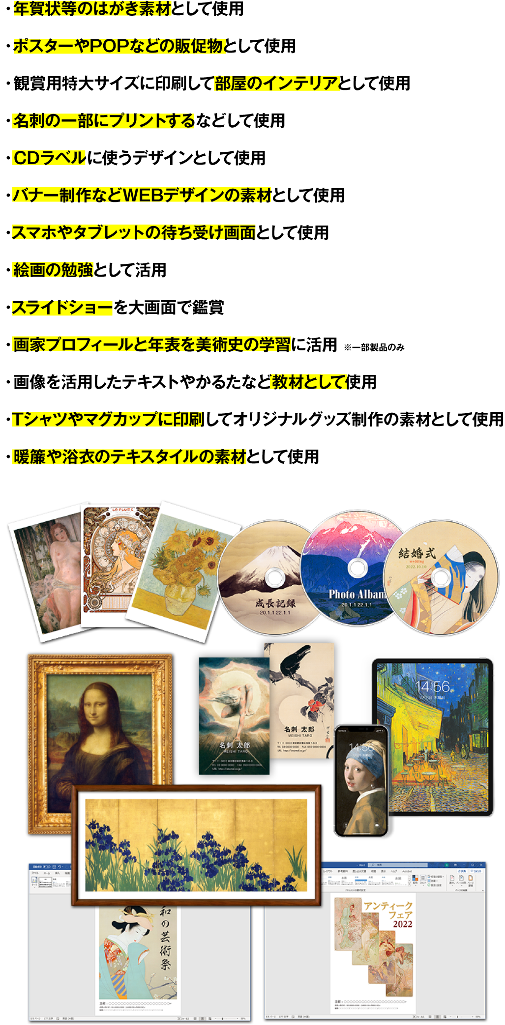 ※本製品が提供する名画素材は自由にお使いいただけますが、プログラム及び名画に付随するテキストは、権利者の許可なく複製、転用、販売などの二次利用を固くお断りしております。