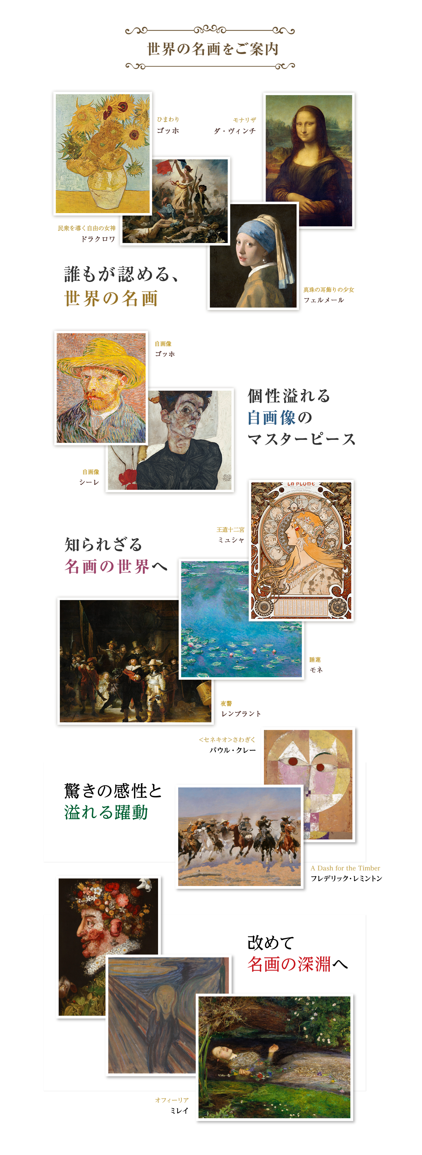 フェルメール、モネ、ゴッホ、ミュシャ、レンブラント、スーラ、ロートレック、ターナー、ミレイ、ミレー、セザンヌ、ルノワール、ゴーギャン、クリムト、シーレ、ムンク、ブリューゲル、グレコ、ドガ、マネ、ダ・ヴィンチ、ボッティチェッリ、ラファエロ、ベラスケス、ルーベンス、ゴヤ、ルソー、フラゴナール、ダヴィッド、ドラクロワ、ブーシェ、シャルダン、シニャック、アルチンボルド、クルーベ、モロー、フリードリヒ、シスレー、ピサロ、カラヴァッジオ、ベックリン、ファン・エイク、コンスタブル、カバネル、ホーマー、ホイッスラー、ドニ、サージェント、モンドリアン、モディリアーニ