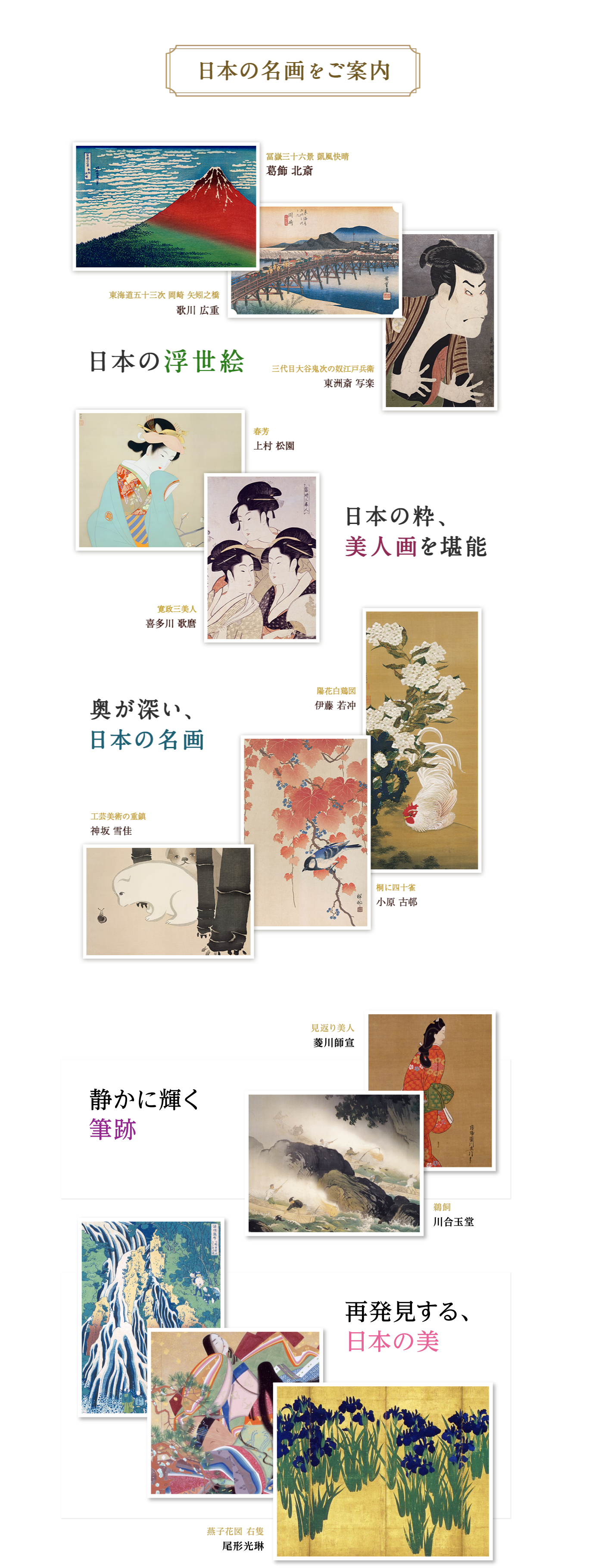 青木繁、池大雅、伊藤若冲、今村紫紅、上村松園、歌川国芳、歌川広重、尾形光琳、小原古邨、葛飾北斎、狩野永徳、狩野内膳、狩野芳崖、狩野元信、川瀬巴水、岸田劉生、喜多川歌麿、黒田清輝、渓斎英泉、幸野楳嶺、児島虎次郎、小村雪岱、佐伯祐三、下村観山、雪舟、曾我蕭白、高橋松亭、高橋由一、高畠華宵、竹内栖鳳、竹久夢二、月岡芳年、土田麦僊、東洲斎写楽、二代目 長谷川貞信、橋口五葉、長谷川等伯、速水御舟、菱田春草、松岡映丘、円山応挙、村上華岳、安井曾太郎、横山大観、吉田博、萬鉄五郎