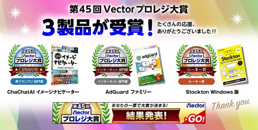 いつも弊社製品をご利用いただきありがとうございます。このたび、パソコンソフトのダウンロード販売サイト「VECTOR」にて、2025年に最も人気のあったダウンロードソフトを投票によって決める祭典「ベクタープロレジ大賞」が開催されました。